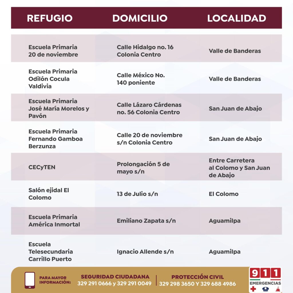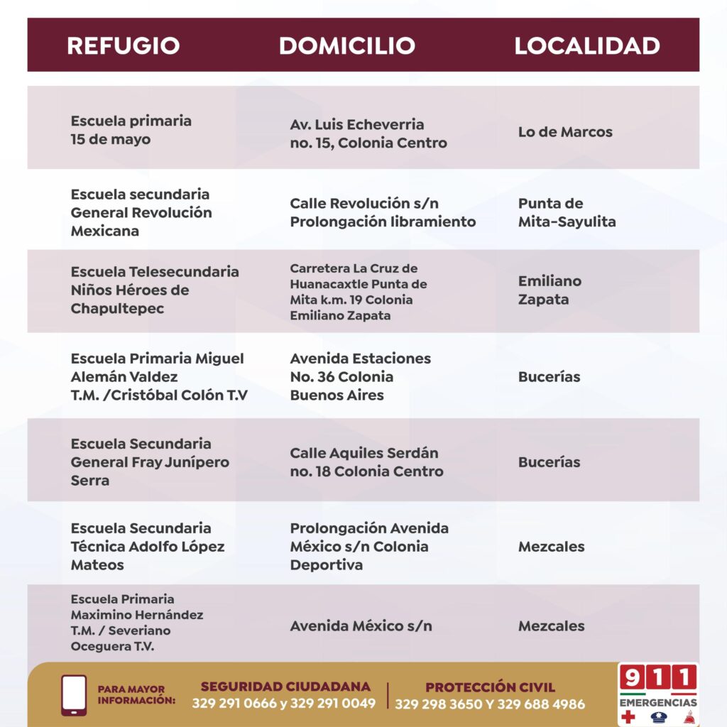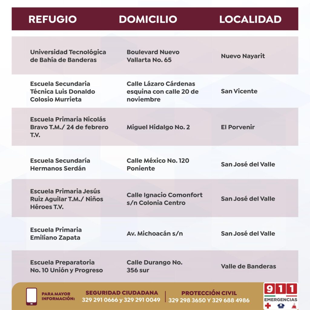 El Gobierno Municipal de Bahía de Banderas, a través de la Dirección de Protección Civil y Seguridad Ciudadana, dio a conocer la lista de refugios temporales habilitados en distintas localidades del municipio, con el propósito de brindar resguardo a la población en caso de presentarse una situación de emergencia por fenómenos naturales.
