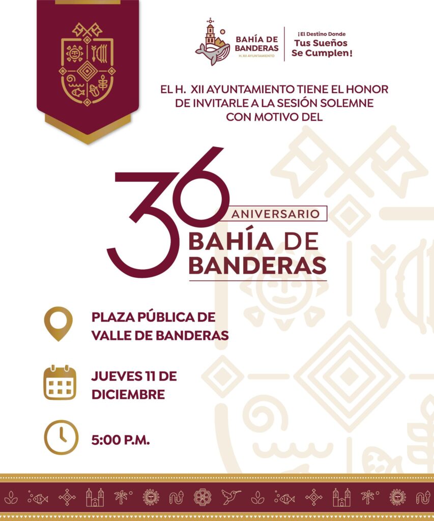 Bahía de Banderas cumple este 11 de diciembre 36 años como municipio autónomo en el estado de Nayarit, y para conmemorarlo, el Honorable XII Ayuntamiento invita a la ciudadanía a participar en la Sesión Solemne que marcará esta importante fecha.