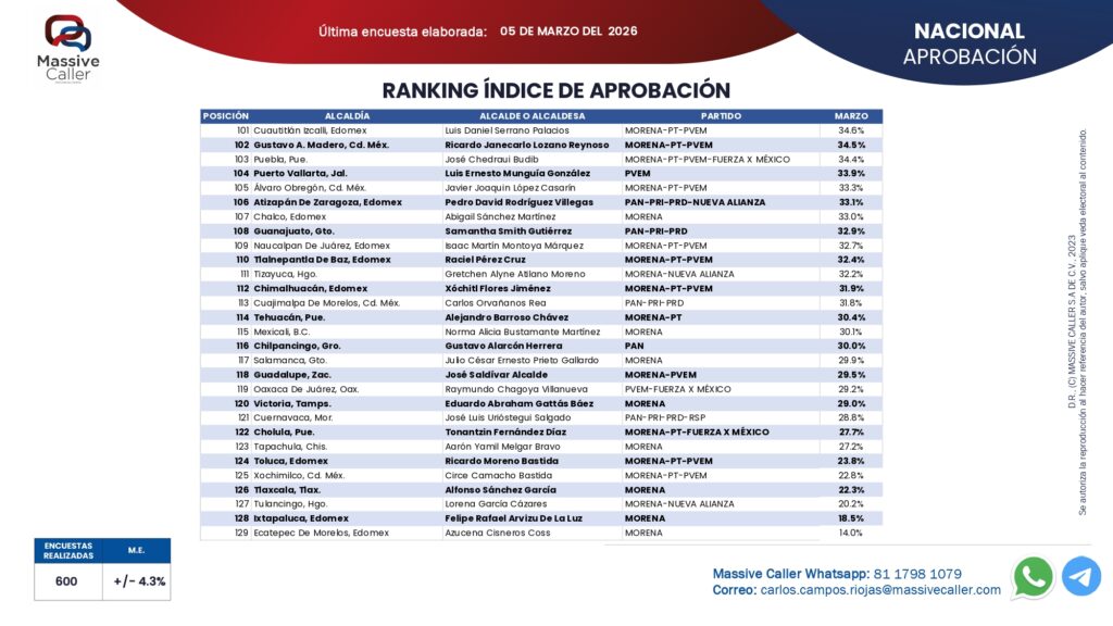 El estudio, levantado el 5 de marzo de 2026, le otorga apenas 17.5% de aprobación ciudadana, muy por debajo del primer lugar del ranking, el alcalde de Zapopan, Juan José Frangie, quien alcanzó cerca de 40%.