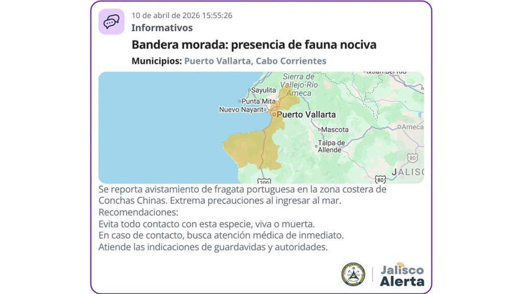 Autoridades emitieron una alerta este 10 de abril de 2026 por la presencia de fauna nociva en playas de Puerto Vallarta y Cabo Corrientes, específicamente por el avistamiento de fragata portuguesa en la zona costera de Conchas Chinas.